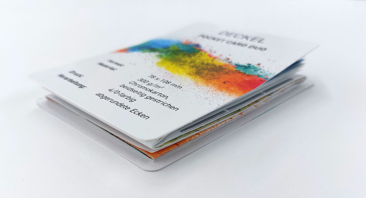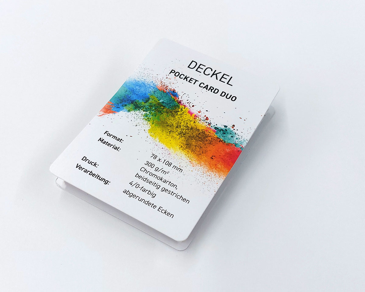 Mit ihrem cleveren Design lässt sie sich mühelos in der Tasche verstauen und bietet gleichzeitig eine großzügige Fläche für Informationen. Egal ob auf Reisen, beim Wandern oder als handlicher Informationsflyer – die Pocketcard Duo ist Ihr perfekter Begleiter, um Informationen übersichtlich und leicht zugänglich zu halten.